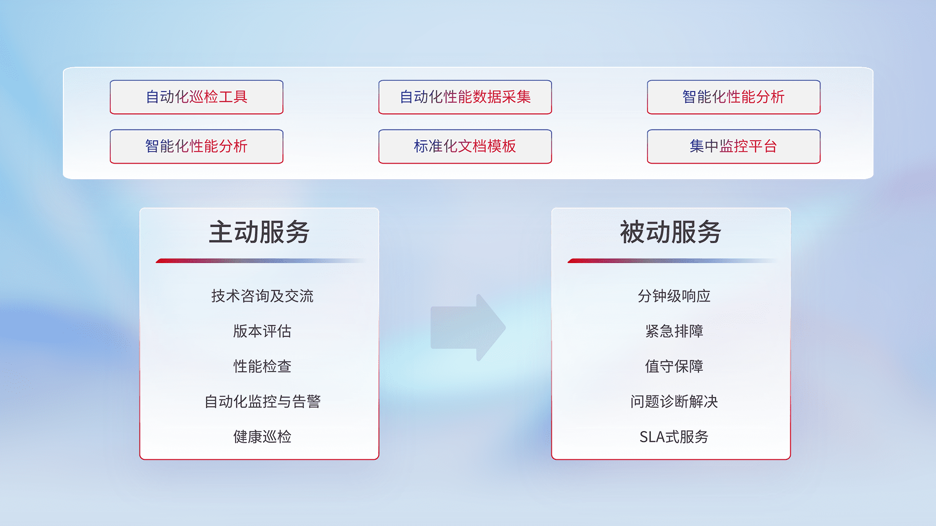 智能化工具和标准化文档,,,保障服务质量,,,,提供主动服务(包含技术咨询、、版本评估、、、性能检查、、、、自动化监控与告警、、健康巡检)和被动服务包含(分钟级响应、、紧急排障、、、、值守保障、、问题诊断解决、、、、SLA服务)。。